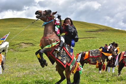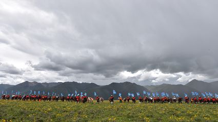 花海上、馬匹間,康巴漢子摩拳擦掌;藍天下、溪流旁,盛裝觀眾搖旗吶喊。19日,作為運動會的分項活動之一,德差鄉(xiāng)羊格貢草原上演了一場500匹駿馬在康巴漢子駕馭下同場飛奔的馬術表演視覺盛宴。伴隨著鏗鏘有力的馬蹄聲、駿馬的嘶鳴聲和觀眾的歡呼聲,一幅集奔騰之美、力量之美、風光之美于一體的壯美畫卷快速閃過觀眾眼簾。