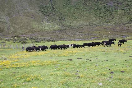 隨著海拔高度的升高與緯度的增加,一路上的植被類型也在不斷發(fā)生著變化。穿越深闊的暗針葉林,六匹馬起起落落的腳力踩出了一個馬幫的回音,所有的植物在各自的生命活動中散發(fā)出了清新怡人的芬多精,吉美為此小聲哼唱起了愉悅的歌兒,細聽卻又像是兩只云雀在不遠處鳴囀。再往上走,周遭的林木又轉(zhuǎn)換成了密致的高山杜鵑林,無數(shù)修長的木流蘇垂掛在樹枝上,像哈達。一路沉默的南杰轉(zhuǎn)頭來開始與我說話“六月間,這里的每一棵樹都開滿了粉白的花朵,一樹樹的煞是壯觀好看,我一個人經(jīng)過,總能聽到一朵、兩朵花鈍落的聲音。最初,我以為是馬雞飛落了,輕聲走入林中打探,身后又會落下一朵、兩朵花,那聲音厚重沉實,林中又過于安靜,我就慌忙走出了林子......”南杰說話聲音秀氣,我聽得時斷時續(xù),過風(fēng)吹送著南杰話語中杜鵑花的香氣。前路逐漸敞亮起來的時候,路邊的杜鵑樹開始變得稀稀落落了,只見路旁堆壘著高高低低的新鮮柴垛。再往上就沒有樹木了,只有矮腳盤香和淺草,路邊的山包上緊貼著密密麻麻的貌似多肉植物的草葉,從草心抽出來一枝枝薔薇紅的花柱在風(fēng)中頻頻點頭。雍貝在前方的馬匹上頭低得越來越沉,以為他瞌睡,我喊了聲貝,他回頭看我,面色灰白嘴唇有些發(fā)紫。南杰回望我們后一躍下馬,從路邊的淺草中折斷幾根盤香枝別在雍貝的耳際,說是可以抵御高反。剩余的兩根遞給我,細小的枝葉上積著一層薄薄地灰色粉塵,深嗅有松脂的清香氣味,安人心神。