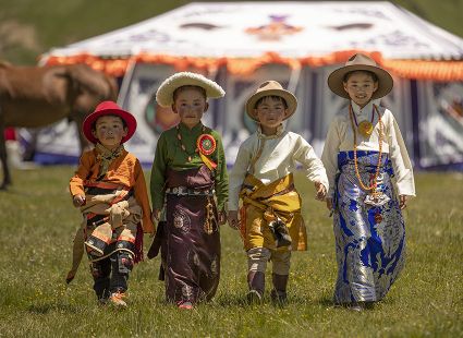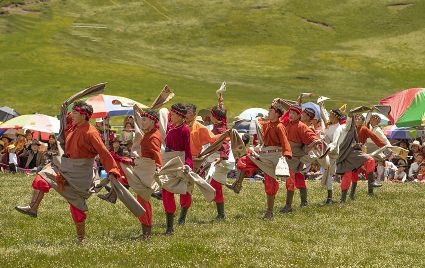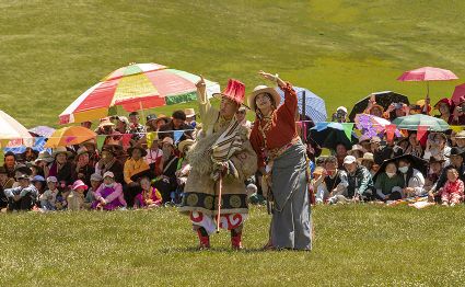 據(jù)說(shuō)早在吐蕃時(shí)期,人們以村寨為單位,在本教僧人的帶領(lǐng)下高舉幡桿,手拿青棵、麥穗,繞田間地頭轉(zhuǎn)圈,祈禱神靈保佑,獲得豐收。儀式結(jié)束后,就在草場(chǎng)上展開(kāi)角斗、斗劍、耍梭標(biāo)等活動(dòng)。格魯派興起后,這一活動(dòng)仍得到保留,只是在繞地巡游時(shí),人們要舉佛像、背經(jīng)文,文體活動(dòng)也增加了賽馬、射箭、馬術(shù)、藏戲、民間歌舞等內(nèi)容。解放后,革去了繞地巡游等一些宗教儀軌,增加了許多休閑娛樂(lè)、物資交流的內(nèi)容。“望果節(jié)”沒(méi)有固定日期,各地根據(jù)農(nóng)事而定,一般在秋收前(8月)擇吉日舉行,時(shí)間1-3天。