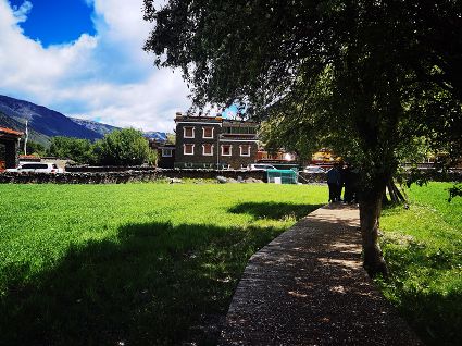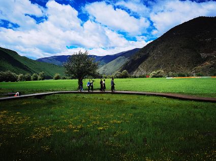 夏日,暖陽(yáng)溫柔,沿途入眼皆是綠意。聽(tīng)說(shuō),俄色花盛放的時(shí)候,潔白的花成簇成團(tuán),一樹(shù)樹(shù)漫山遍野,像九天的云朵堆滿山谷田野,汽車從公路疾馳,風(fēng)里都是俄色的清香。我們來(lái)的時(shí)候稍微遲了,錯(cuò)過(guò)了俄色的花期,花開(kāi)荼蘼,殘花在蒼翠的枝葉里躲藏,風(fēng)里是飛舞的花瓣,紛紛揚(yáng)揚(yáng),在棕紅的棧道鋪成白色的云錦,樹(shù)下是芬芳的余味。棧道邊,金黃的雪白的野花鋪灑在翠綠的草甸上,像濃烈的水彩。地里的青稞,綠得晃人眼睛,綿延的是木雅人勤勞與希望。遠(yuǎn)處,木雅民居在各種深綠淺綠的陪襯下更加的濃墨重彩。
