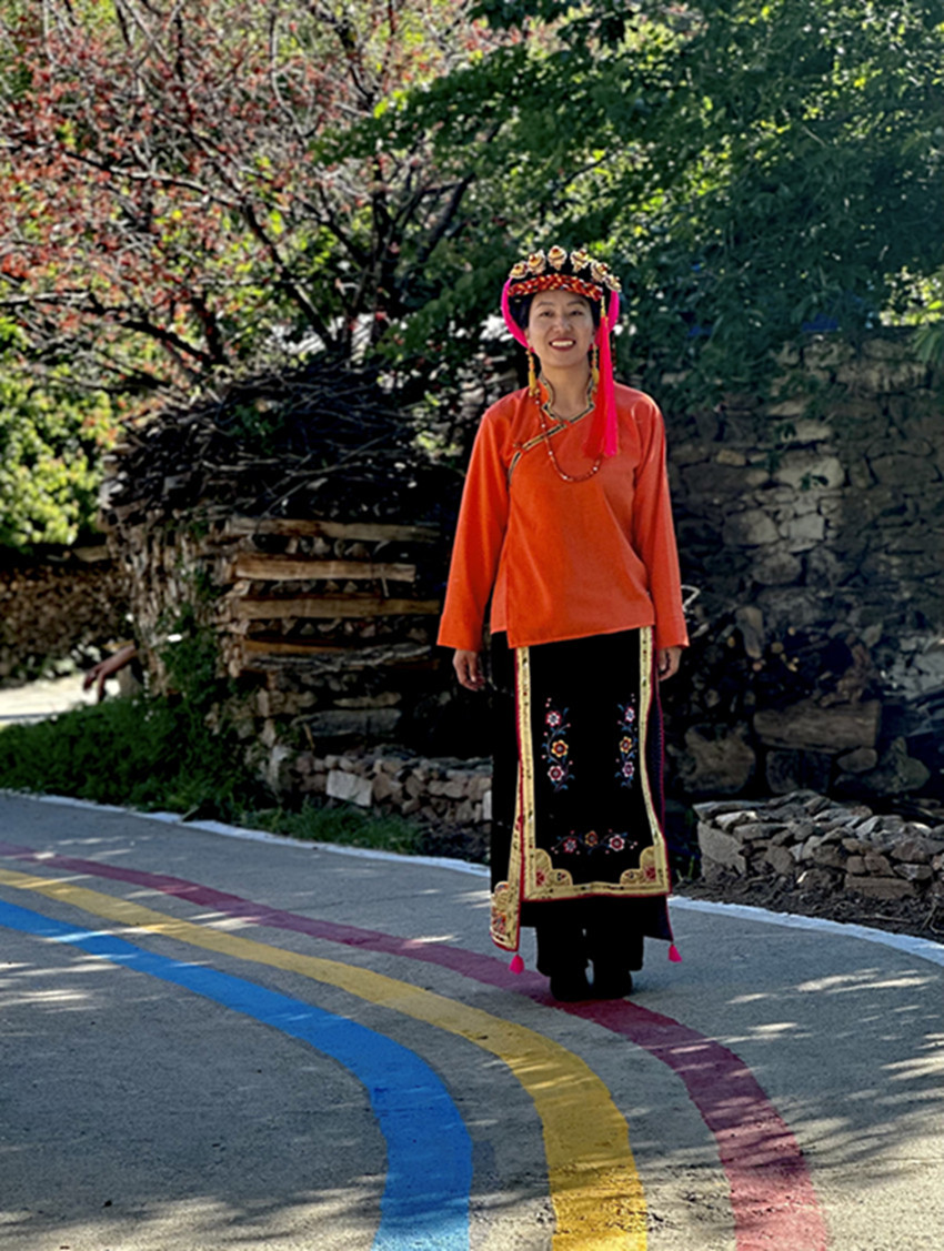 彩色鋪裝的通村路兩邊,成片的苞谷林正在背紅纓,風(fēng)中響著緊密結(jié)實(shí)的聲音。各種果木枝繁葉茂,結(jié)滿了寶石般紅紅綠綠的果子。一排柴垛上方,伸出很大一片橙色的小果子,沒(méi)有葉子,我們像賞花一樣欣喜于它的紅艷。嘉絨姑娘悄默地走在我們身邊,她的手里擺弄著一片草葉,安靜而美好,是感到這一路上的莊稼果木已經(jīng)足夠繁盛。