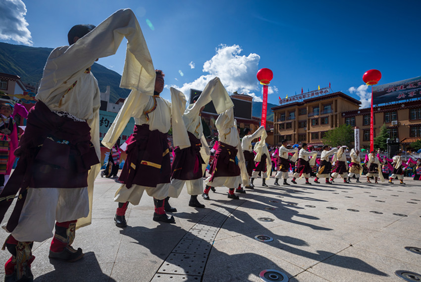 金弦子廣場,舞者們仿若守護(hù)者一般,圍著金黃色的弦子雕塑,或輕歌曼舞或昂揚踏步,斑斕的畢旺、搖曳的流蘇和飄逸的紅袖與花共舞,與景相映,聲聲吟唱、步步踏尋,是追憶更是誓言。