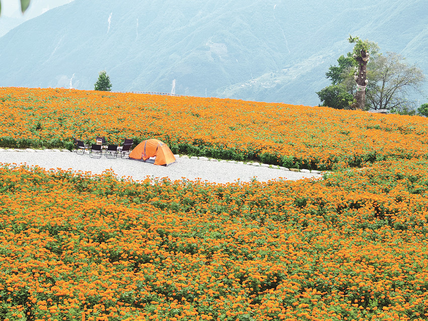 在這金風(fēng)送爽的秋日,瀘定德威加郡海子村18萬(wàn)株萬(wàn)壽菊競(jìng)相綻放,漫步在花海之中,人們可以感受秋風(fēng)的輕撫,呼吸清新的空氣,寧?kù)o的村寨依托著貢嘎雪山、藍(lán)天白云,在成片的萬(wàn)壽菊裝點(diǎn)下構(gòu)成了一幅亮麗的鄉(xiāng)村畫(huà)卷。