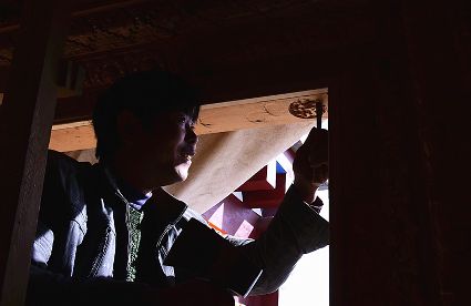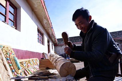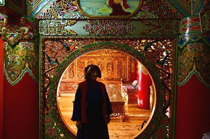道孚民居的精華在其內(nèi)部,木材是其唯一的內(nèi)部裝飾材料,而裝飾,是一項繁瑣得曠日持久的藝術(shù)勞作,往往建房只需一兩個月,內(nèi)部裝飾則要幾年甚至幾十年。民間建筑藝術(shù)家們沉醉在細(xì)致入微的勞作里,讓每一個圖案都盈溢一份心底的吉祥,讓每一筆描摹都傳遞一份動人的傳說。房間四壁、房門和梁柱上一般都繪滿了精致典型的藏式壁畫,窗上分別雕刻著龍、鳳、仙鶴、麒麟等吉祥圖案。每間屋的大門上都鑲嵌醒目的兩個獅頭大銅環(huán),凸顯了與之相融的漢文化的特點。置身其間,色彩斑斕中,身邊盡是龍飛鳳舞,鶴翔麟躍。繽紛中細(xì)端詳,真是藏民族藝術(shù)的天堂!