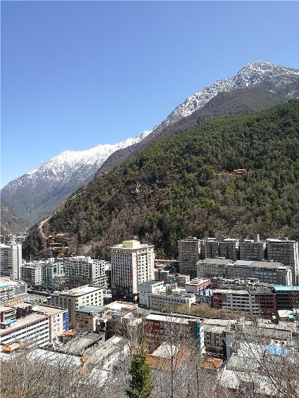 天空像剛被浸染的綢緞,蔚藍(lán)的主色已經(jīng)略顯;白雪好似從浸染的綢緞上滴落下的顏料與其它顏色的混合,眷戀的駐足在山尖,在其耳旁傾訴來年的約定;一顆顆萬年青穩(wěn)穩(wěn)的站立,將山中的寺廟、亭閣緊緊地包圍,見證著康定四季輪回的變化;依然披著秋冬贈予黃色外衣的樹木,拋開桎梏,堅守在一座座樓房旁。藍(lán)與白,黃與綠……這大美的晴天為人們帶來了別樣的視覺盛宴。