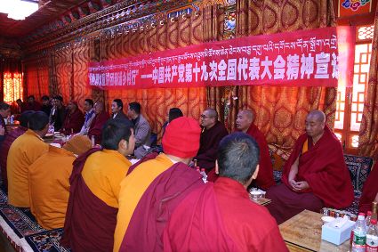 宣講團成員勇勇用藏語激情洋溢的宣講黨的十九大精神,現(xiàn)場不斷響起熱烈的掌聲。當勇勇講到我國五年來取得的輝煌成就時,僧人們都激動不已,紛紛為發(fā)展成就點贊?!奥犃私裉斓男v,我進一步了解到了我們國家這些年來取得的發(fā)展成就。一直以來,黨對我們的關懷是看得見摸得著的,現(xiàn)在我們的寺廟管理越來越規(guī)范,基礎設施也得到了完善,通往寺廟的道路也有了明顯改善,我們的生活越來越好了,這一切都是共產(chǎn)黨的功勞?!彼聫R僧人尺乃表達著對黨的感恩。