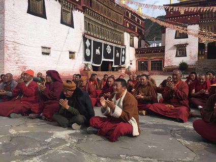 當宣講組一行來到郭沙寺時,寺廟僧人們早已迫不及待的等候在寺廟外?!奥犝f你們今天要來,我們?nèi)律舷露己芨吲d、很期待。”寺廟堪布甲它激動地說。