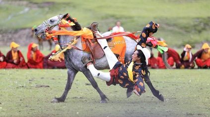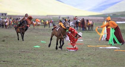 7月23日,四川甘孜藏族自治州理塘縣村戈鄉(xiāng)賽馬活動(dòng)開始,牧民們?cè)隈R背上一顯身手。每年藏歷六月,當(dāng)草原上格桑花盛開的時(shí)候,四川省理塘縣24個(gè)鄉(xiāng)(鎮(zhèn))就會(huì)按照習(xí)俗舉辦隆重的賽馬會(huì)來(lái)拜祭神山,慶祝豐收。迄今有400多年歷史的賽馬分為耐力賽、小走賽、馬術(shù)賽等,其中最為精彩的是馬術(shù)賽:馬肚藏身、馬背倒立、飛騎射擊、拾哈達(dá)等,驚險(xiǎn)刺激。2008年6月,此項(xiàng)活動(dòng)被列入四川省級(jí)非物質(zhì)文化遺產(chǎn)保護(hù)項(xiàng)目。(朱虹 葉強(qiáng)平)