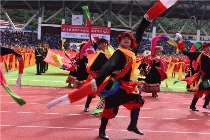 “本屆少數(shù)民族傳統(tǒng)體育運(yùn)動(dòng)會(huì)的會(huì)徽以格薩爾王賽馬登位為基本形象,由字母‘SC’組成的騎手代表‘四川’,數(shù)字‘15’組成了昂揚(yáng)奔騰的‘馬’為主體的形象,代表‘15屆民運(yùn)會(huì)’。這既有藏民族特色,又顯得美觀大方?!痹陂_幕式現(xiàn)場,來自杭州的陳琳興致勃勃地說。