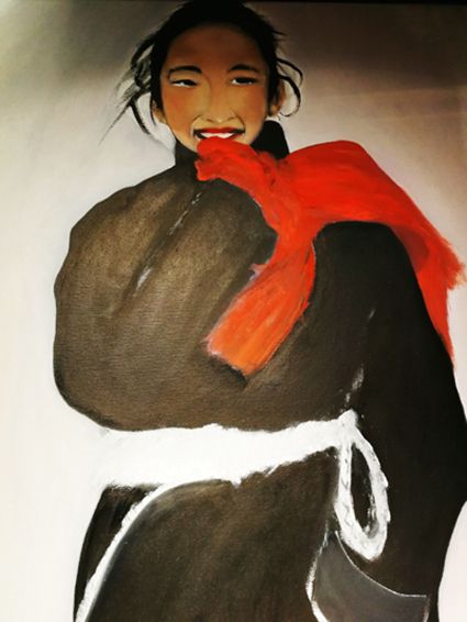 畫畫三年多了。十三歲寫詩;到了高原后,方開始創(chuàng)作長篇小說。在上海,我做過畫廊。但要說斗膽動筆畫幅肖像。我是在白度母唐卡前燃了三炷香的。包括在咖啡店現(xiàn)場作畫。到京城繼而國外辦畫展,我認為都是因了我把畫布當成了詩稿的緣故。于是,大家喜歡我這種野路子,天馬行空,可又不舍方圓的創(chuàng)作手法。接下來,歐洲、東京還會有我的系列展覽。