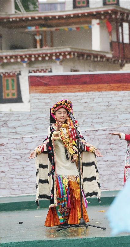 比賽開始不久,現(xiàn)場下起了小雨,但絲毫沒有影響熱烈氣氛。臺上的佳麗們,略施粉黛,穿著承載著嘉絨風情文化的民族盛裝,自我介紹,優(yōu)雅展示。臺下,則是鄉(xiāng)民齊聚,熱情高漲。大家紛紛到場,為佳麗們加油助威。據(jù)介紹,丹巴出美女始于漢代的東女國時期。古時每年農(nóng)作物收獲的時節(jié),丹巴各村各寨都要舉行盛大的選美和祭祀活動。