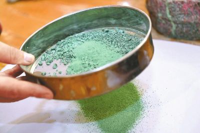 傳統(tǒng)的唐卡是藏族文化中一種獨(dú)具特色的繪畫藝術(shù)形式,需經(jīng)繃布、打磨、定位、起稿、涂色、暈染、拉線條、拉金線等多種程序,天然原料作色保證了畫作幾百年后色澤還依然鮮艷。在著著的畫室里,擺放了百個(gè)裝滿各色礦物質(zhì)顏料的調(diào)色小碗,“上色用的是延續(xù)千年的礦物研磨顏料?!睘榱俗岊伭献魃鶆颍€用自己的辦法搞出了專用的顏料攪拌機(jī)。