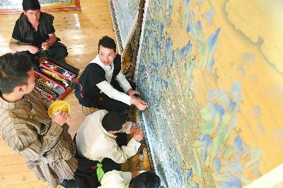 著著是當(dāng)?shù)匦∮忻麣獾漠嫀煟?4歲從臨摹、勾線定型、著色染色開始學(xué)起,3年后就出師獨(dú)立作畫。17年時(shí)間,他繪制了3000多平方米的壁畫和數(shù)百幅唐卡,光筆就畫禿了20000多支。去年,著著憑借《南絲路一帶緣藏漢人一家親》成為當(dāng)年文藝界最高獎(jiǎng)山花獎(jiǎng)的獲得者。今年,他圍繞“一帶一路、藏漢和睦”為主題而創(chuàng)作的大幅唐卡畫作也即將收尾。