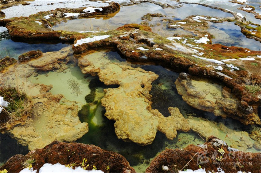 灘長(zhǎng)約3000米,寬約200米,共有7個(gè)臺(tái)階,上面形成了大小不一的彩池,里面的各類水生植物,暢游的羌活魚(小鯢)等,給這片古老的地質(zhì)奇觀帶來了無限的生機(jī)。在海拔4300米處,有一眼噴出1.5米高的溫泉,水溫常年在30度左右,是玉龍泉華灘的主要水源。