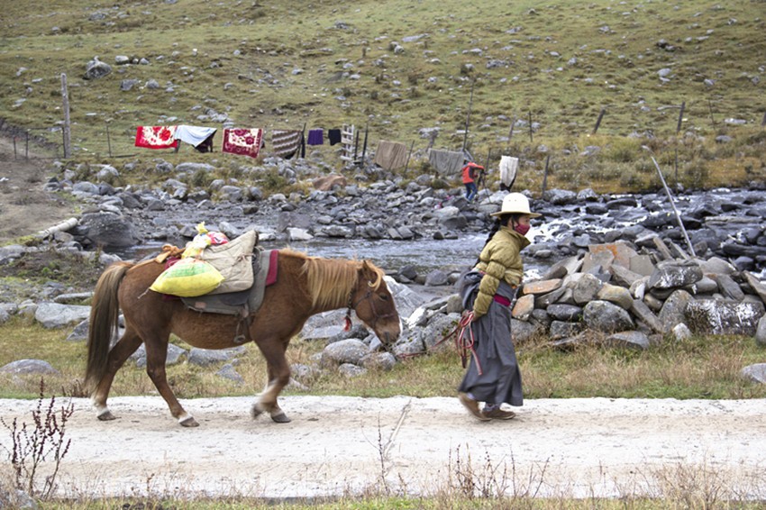 莫斯卡的女人或在寺廟點酥油燈,或帶孩子,或牽馬牧草,或在溪邊淘衣,或出門打水……她們的勤勞和樸實滋養(yǎng)著莫斯卡,滋養(yǎng)著莫斯卡的生命。她們用黑、紅、綠那樣跳躍的顏色搭配出獨具風(fēng)格的服飾,背著你遠去,又迎著你走來,她們美麗的背影裝扮了寂靜的莫斯卡小巷。