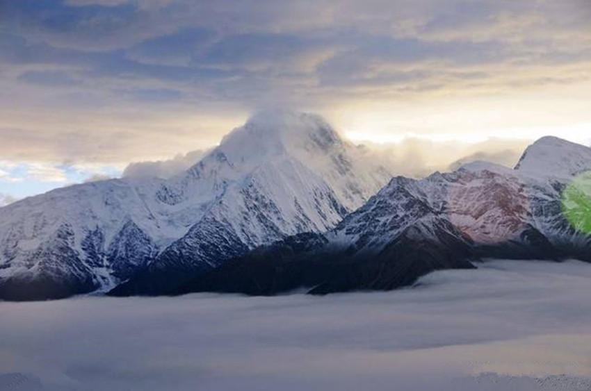 貢嘎山位于康定城南約55千米處,“貢嘎”為藏語“雪白”之意。貢嘎山險峻挺拔,峰項有70平方米的平臺,終年積雪覆蓋,晴空萬里時,閃耀著熠熠光芒,瑰麗壯觀。