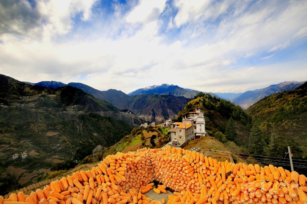 丹巴的村寨呈現(xiàn)出一派多彩的畫(huà)面。在甲居藏寨,山寨依山面水,紅白相間的民居從大金河谷層層疊疊向上攀援,錯(cuò)落有致地散布在山坡上;在中路藏寨,云霧繚繞,目光所及之處皆是晾曬的豐收?qǐng)鼍埃r紅的辣椒與黃澄澄的玉米勾勒成一幅田園牧歌畫(huà)卷。