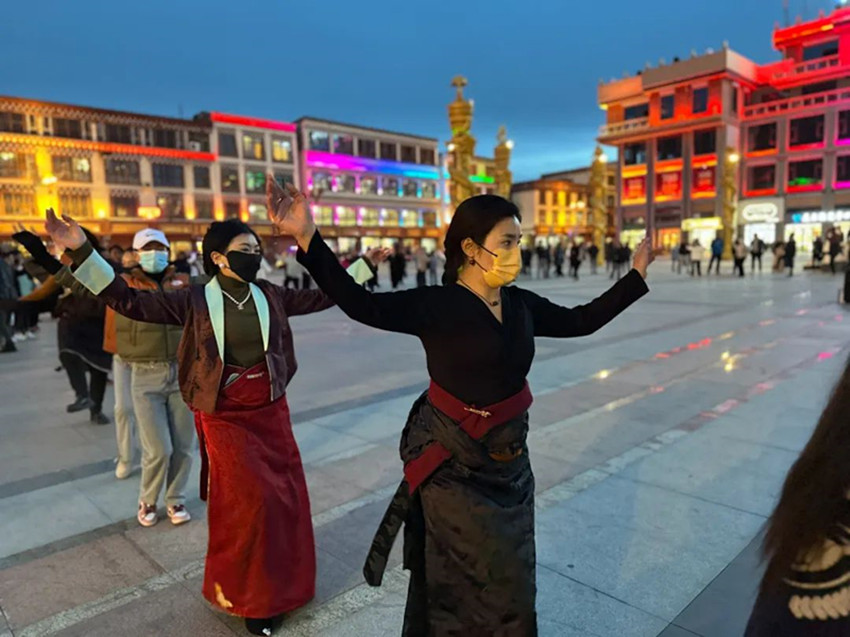 本網(wǎng)訊 每到傍晚時分,色達(dá)的金馬廣場上都會準(zhǔn)時響起起歡快的鍋莊曲。 舞者們雙手隨音樂自然張開,邁著輕快的步伐,踢腿、揚(yáng)手、轉(zhuǎn)圈。游客們有的拿起手機(jī)拍照留念,有的則加入鍋莊舞的隊列。