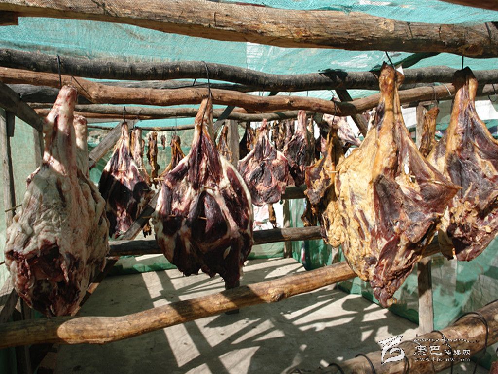 丹巴嘉絨藏族年期間,在酸菜包子、火燒饃、香豬腿等眾多的風(fēng)味飲食中,“藏香豬腿”是必不可缺的美食佳肴,也是給長(zhǎng)輩拜年和親朋好友間互送的最佳禮品。“藏香豬腿”的制作方式也象丹巴嘉絨藏族年一樣的獨(dú)特。丹巴人宰殺年豬的方式通常有用繩索死吊或者用刀從勁入殺心臟致死兩種,現(xiàn)在采用后一種方式宰殺豬居多。當(dāng)?shù)厝藢⒇i宰殺后用熱水燙,處理好豬毛,再在胸口用刀開一孔,將手伸人胸腔扯斷心肺連接處,然后將其剖開,并把肥、瘦豬肉分離開,剝?nèi)グ逵?,處理好其他?nèi)臟,將豬腿按原形分離,爾后經(jīng)霜凍、柏枝熏、自然風(fēng)干后存放在儲(chǔ)藏室內(nèi)。豬腿存放一冬后,色、香、味俱佳。食用時(shí)煮成半熟或用炭火將表皮烘烤,切成小塊狀或撕成粉絲狀,在百米內(nèi)即可聞到香味,入口鮮嫩清香,營(yíng)養(yǎng)豐富,誘人食欲。