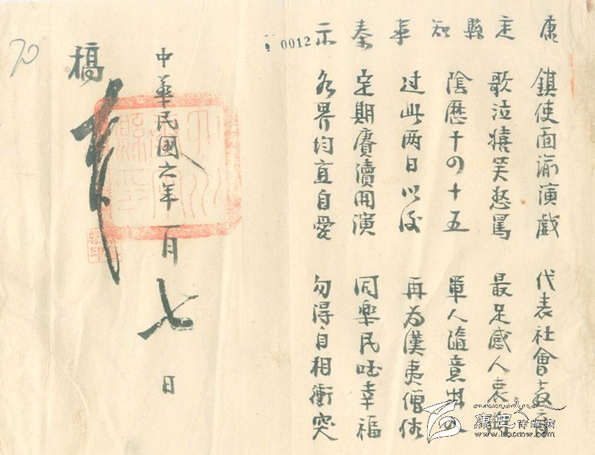 除此之外,康定縣知事又煞費(fèi)苦心地再寫了一篇“順口溜”式的告示,告示上寫道:鎮(zhèn)使面喻演戲,代表社會(huì)教育。歌泣嬉笑怒罵,最足感人衷曲。陰歷十四十五,軍人隨意出入。過此兩日以后,再為漢藏僧俗。定期庚續(xù)開演,同樂民國(guó)幸福。各界均宜自愛,不得自相沖突。