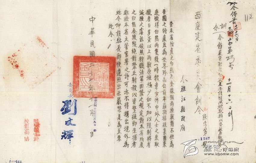 民國(guó)27年(公元1938年),“西康省建省委員會(huì)”發(fā)出“經(jīng)字第1287號(hào)”訓(xùn)令,這是一份難能可貴的保護(hù)野生動(dòng)物的訓(xùn)令,訓(xùn)令說:“查本省所產(chǎn)之白熊及金線猴兩種獸類,不但為吾國(guó)之特產(chǎn),且為世界珍品。自前年羅斯福采集團(tuán)來康獵得白熊兩只后,一時(shí)報(bào)章宣傳,中外人士之來取獵者日多。查以上兩獸原種極少,如不加以限制,將有滅種之虞。茲依照狩獵法第四條之規(guī)定,對(duì)本省所產(chǎn)之白熊、金線猴絕對(duì)禁止射殺,以資繁殖。即生捕者非經(jīng)本省主管官署之許可,不得帶出境外。為此令仰該縣長(zhǎng)即便遵照出示嚴(yán)禁是為至要,此令。”訓(xùn)令最后署有“西康建省委員會(huì)委員長(zhǎng)劉文輝”的簽名。