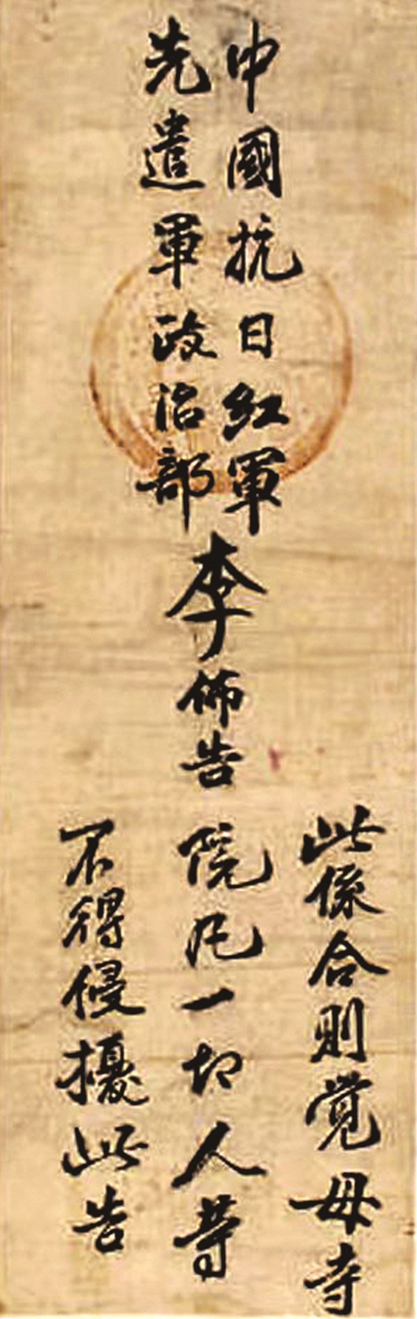 該布告和其他的布告在書寫形式上有所區(qū)別,不是現(xiàn)在常見的橫向的,是豎向的,按照上中下分三部分,發(fā)布方、責任人、發(fā)布內(nèi)容。它的落款也就是發(fā)布方的單位在上面,左右對稱,蓋章可以辨認為:中國工農(nóng)紅軍第四方面軍第三十軍政治部。中間是發(fā)布人李先念的姓李,比其他字大一倍,以示突出。在下方是布告的內(nèi)容。書寫者以行書書寫,一氣呵成,整體結(jié)構(gòu)勻稱,字體大小適中,內(nèi)容簡明扼要。布告歷經(jīng)多年,保存完好,說明寺院的收藏者對布告的內(nèi)容認可,對書寫者書法充滿敬意。