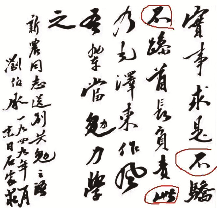 以上是劉帥1949年的書法,距離1936年13年的時間,“不” “此”二字,明顯與布告上的風格一致。國、合、軍等單個的字,在建國后的書法作品與布告比較,都可以在劉帥其他書法中看到明顯出自一人。