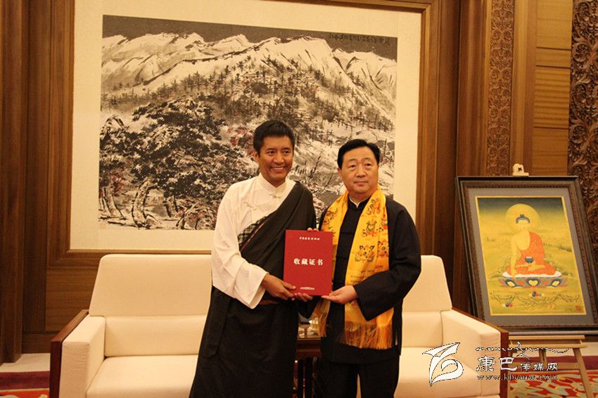 產(chǎn)業(yè)化發(fā)展的探索之路,不僅圓了年敘·多吉頓珠的“文化產(chǎn)業(yè)夢(mèng)”,而且也讓他實(shí)現(xiàn)了一次華麗轉(zhuǎn)身,成為一名有擔(dān)當(dāng)?shù)钠髽I(yè)家。今年9月5日至15日,由中華文化發(fā)展促進(jìn)會(huì)、西藏自治區(qū)文化廳、西藏自治區(qū)文學(xué)藝術(shù)界聯(lián)合會(huì)、西藏自治區(qū)文化產(chǎn)業(yè)協(xié)會(huì)主辦,西藏崗地文化產(chǎn)業(yè)集團(tuán)、西藏拉姆拉綽唐卡畫(huà)院承辦的“西藏唐卡藝術(shù)——多吉頓珠、丁噶唐卡作品展“在北京中國(guó)國(guó)家博物館舉行。他和丁嘎先生現(xiàn)場(chǎng)向國(guó)家博物館捐贈(zèng)了《釋迦牟尼》、《五方度母》、《綠度母》和《觀音》四幅精品,這是國(guó)家博物館首次收藏多派唐卡和嘎瑪嘎智畫(huà)派唐卡,填補(bǔ)了國(guó)家博物館館藏嘎瑪嘎止畫(huà)派和多派唐卡的空白。國(guó)家博物館館長(zhǎng)呂章申先生熱情為兩位大師頒發(fā)了收藏證書(shū)并激動(dòng)地說(shuō):“多吉頓珠先生和丁嘎先生捐贈(zèng)的精品力作,豐富了中國(guó)國(guó)家博物館的館藏,更好地弘揚(yáng)了西藏文化藝術(shù)。國(guó)家博物館有責(zé)任把最好的藝術(shù)品收藏起來(lái),留存于后世。”