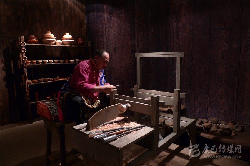 一處古色古香的展柜上,各種藏式木制茶具、碗散發(fā)著古老質(zhì)樸的氣息,天然的花紋自然流暢,色澤婉轉(zhuǎn)溫厚。距離展柜較近的地方,兩架可手工操作的藏式木制機器有規(guī)律地運轉(zhuǎn)著,來自得榮的格絨次仁父子正在機器上演示藏式木碗的制作過程。