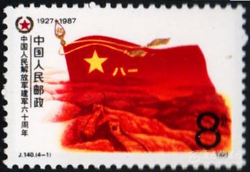 1977年8月1日原郵電部發(fā)行的《中國人民解放軍建軍50周年》紀(jì)念郵票,其中第4枚“雄師過大江”,圖案中一名沖在渡江隊伍前面的戰(zhàn)士高舉一面“八一”軍旗。1987年8月1日原郵電部發(fā)行的《中國人民解放軍建軍60周年》紀(jì)念郵票一套4枚。其中第1枚“軍魂”,郵票上一面鮮紅的“八一”軍旗迎風(fēng)飄揚,旗下是蜿蜒的萬里長城,代表了中國人民解放軍是保衛(wèi)祖國和人民的“鋼鐵長城”。1995年8月1日,原郵電部試發(fā)行一套“義務(wù)兵專用”郵票一套1枚,票名為“神圣的使命”,圖案以紅光四射的“八一”軍旗為背景,以現(xiàn)代化的飛機、坦克、火箭和象征和平的白鴿為襯托,畫面是威武的陸??杖姡@示我軍鋼鐵長城般攻無不克、戰(zhàn)無不勝的精神風(fēng)貌。