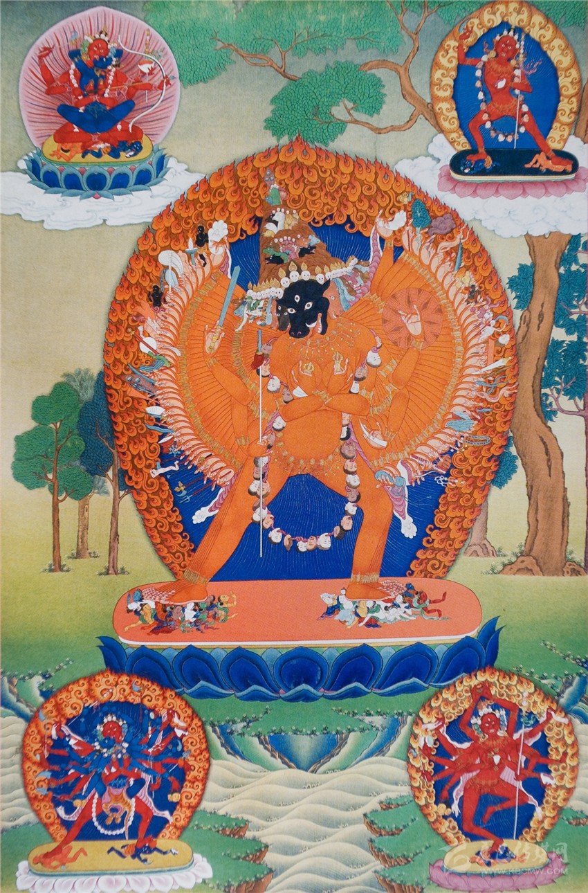 當尼泊爾精致風格的繪畫傳入藏區(qū),通過藏族畫家靜穆的心靈,將粗獷和細膩的相交織,把紅色和綠色共交響,讓嫵媚與莊嚴相融合,形成了具有西藏審美的風格變體。其中,夏魯寺繪畫就是這種典型風格。它有著大面積的色塊對比,又會在局部做精致的裝飾,這正是尼泊爾藝術(shù)影響下的西藏繪畫風格。