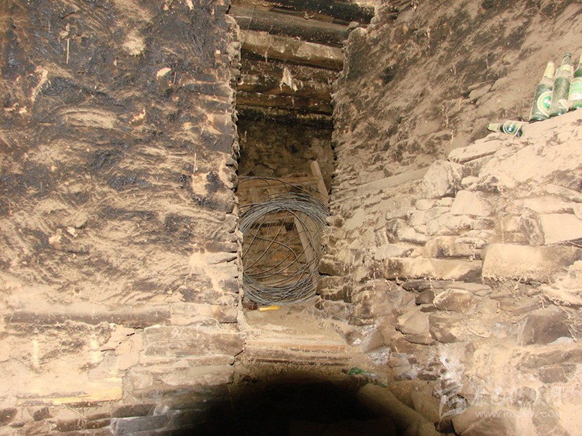 鍋莊房后,有兩道門,其中一間為放置糧食的庫房。而另一間房屋,門檻高于鍋莊房許多,需要跨上兩級臺階才能上去。門較矮小,打開房門,一股潮濕的氣味撲鼻而來,眼前一片漆黑,什么也看不見。我打開隨聲攜帶的電筒,借助微弱的光線,勉強能看見房屋內的擺設。房屋的右面角落里,有用木頭搭建起來的籠子,其高約一百三十厘米,寬約一百厘米。在房屋的左邊,有一曲折的甬道,也需要走上兩級臺階。牟大哥告訴我,這里是用來關押犯人的地方。