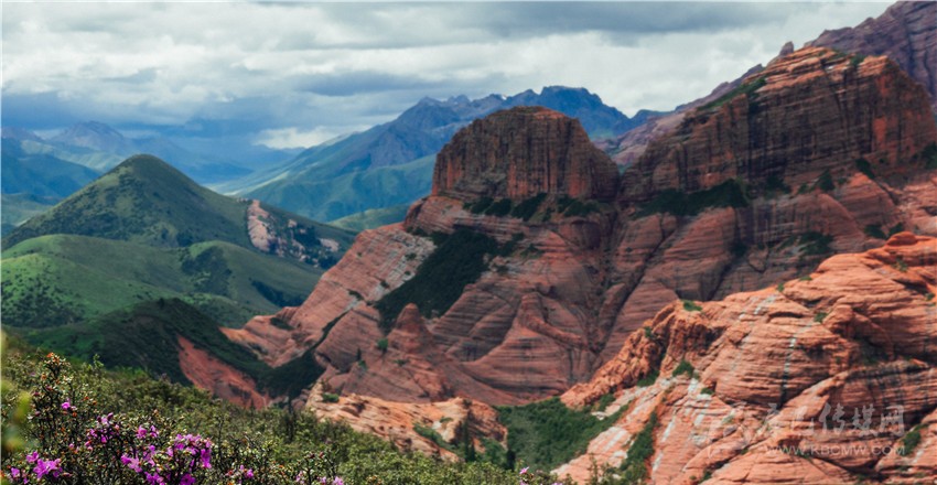 “快看,紅山千年之吻?!币晃挥浾咴隈R背上驚呼。抬頭望去,兩座紅山緊依而立,伴隨藍(lán)天、白云與綠草,構(gòu)成一幅絕妙美景圖;在距丹霞地貌最近的埡口處,大家紛紛下馬觀賞丹霞風(fēng)光?!皦延^震撼、鬼斧神工”,專家學(xué)者無不驚嘆贊絕倫,即便天氣不佳,海拔較高,他們時(shí)而交流討論、時(shí)而拍照留戀,高昂情緒一直持續(xù)。