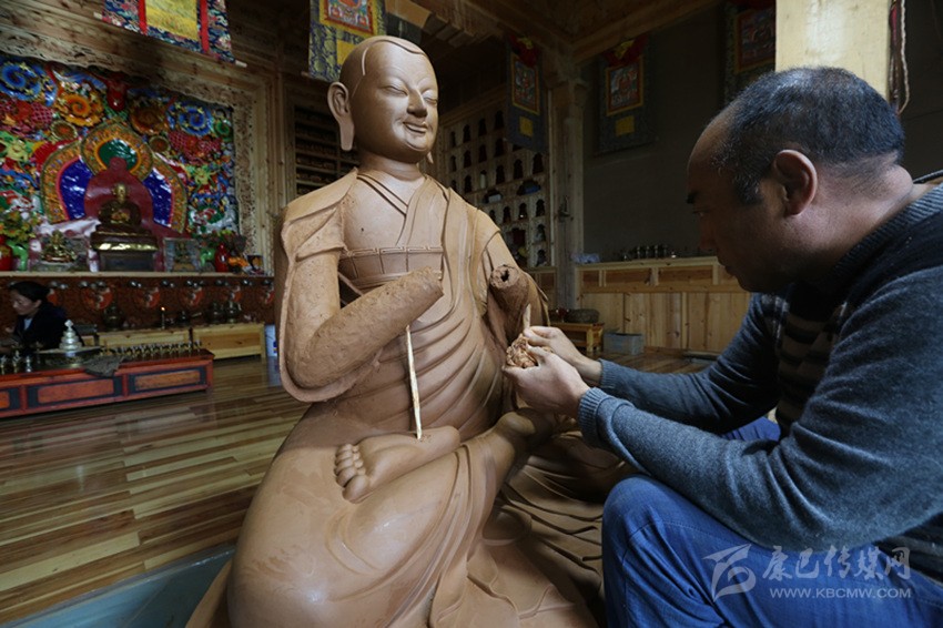見(jiàn)到克村時(shí),他正在鄰村一農(nóng)戶(hù)的經(jīng)堂里制作佛像,盤(pán)坐在蓮花寶座上的宗喀巴大師和兩個(gè)弟子身披袈裟手持經(jīng)書(shū)的泥塑作品神形兼?zhèn)?,這是克村和徒弟多登近半個(gè)月的心血??舜遄诓?jí)|上,心無(wú)旁騖神情專(zhuān)注地,用木制工具對(duì)作品進(jìn)行打磨,旁邊擺放著一盆清水和一筐自制的工具。
