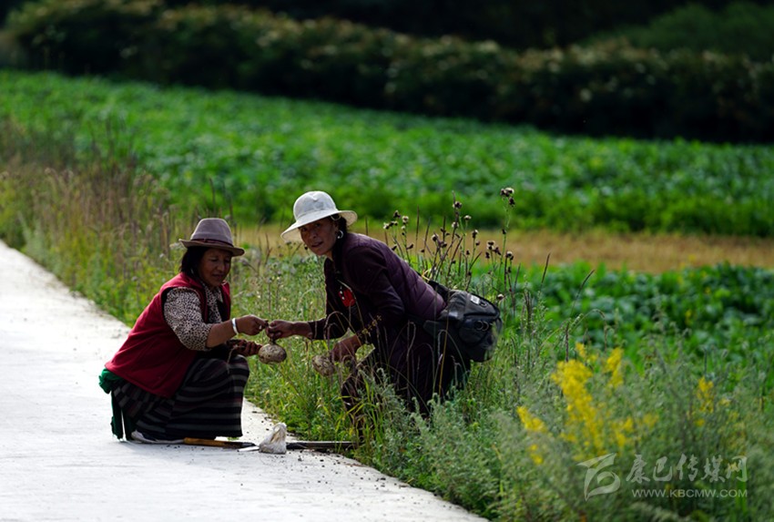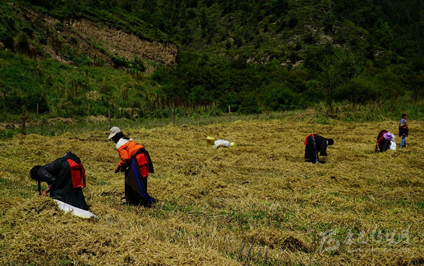 開始收割了,從坡地到川地,到處是收割機(jī)的聲音。青稞是車巴溝的主要作物,因?yàn)橐デ囡?,要吃糌粑。村里人忙得團(tuán)團(tuán)轉(zhuǎn),收割機(jī)開過去,大家就跟在后面撿穗子。如此往復(fù),一直要到糧食拉到家里。