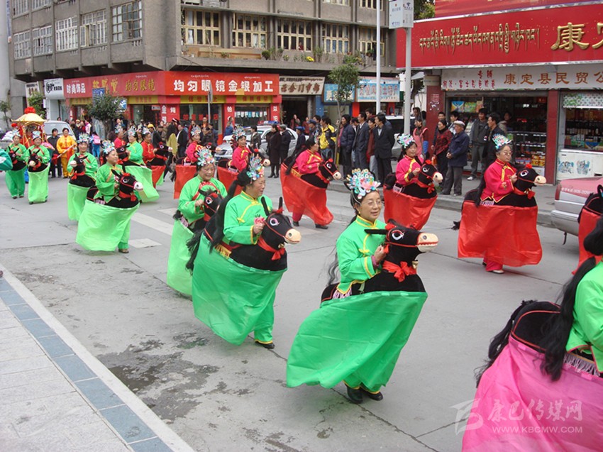半個世紀風靡康定城的“船燈”、“馬馬燈”、“鬧山鼓”、“扭秧歌”、“笑頭和尚戲柳翠”、“霸王鞭”……整個兒就像老陜過年時的“社戲”場面。大年初一、十五夜“出燈”游街,熱鬧氣氛把整個年節(jié)塞得滿滿的。記得我孩童時見過一次“出燈”游行,不是晚上而是在大白天(叫“出游”)。寺廟喇嘛吹奏佛樂走在前面,接著是“川北”人的川劇鑼鼓;再后面跟著的就是“馬馬燈”、劉老陜的“船燈”、鐵木社的“龍燈”、二輕局的“霸王鞭”、南門上的弦子隊、三居委的腰鼓隊、北三巷的“道孚鍋莊隊”……游行隊伍遇街口寬敞地方必圍圈演出?!叭死侠?,人老啦,人老先從頭上老,白的多來黑的少, 開——船——羅!”“銀須飄灑”的艄公劉老陜用俏皮逗趣的陜腔告白開場詞,在歡喜鑼鼓的伴奏中“劃”著旱船出了場。旱船闖“急流”、過“險灘”,風趣又逼真;如果哪家的姑娘打扮成古裝戲里的嬌美仕女坐上旱船游了街,那她立馬就成了康定城人皆贊譽的“美女”。接著就是“馬馬燈”,幾十個“騎馬橫槍”的古裝將士馳騁上場,排兵布陣,穿梭并行,“馬”鈴聲鼓樂聲交織一起……鬧翻了康定城的“三山二水”。