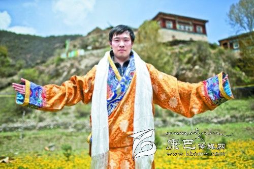 第一次穿上金色的藏裝,戴上潔白的哈達,感覺很奇妙,中國政法大學(xué)的趙丁在藍天白云下為自己留一張影。