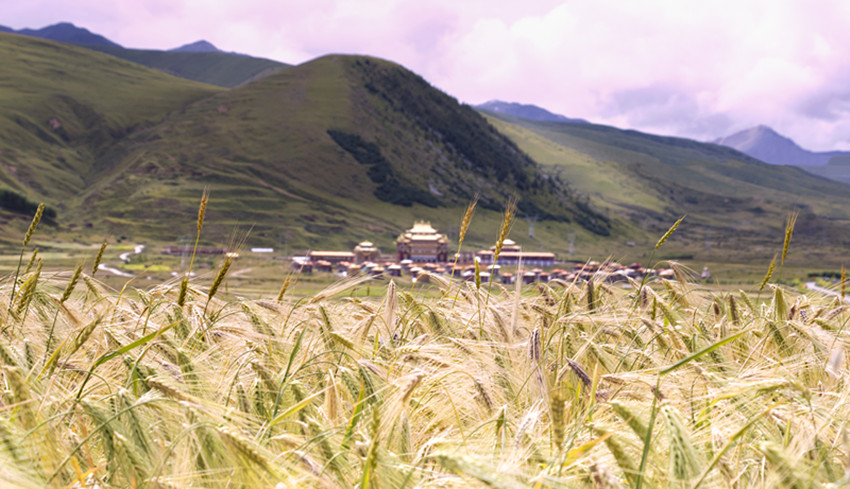 甘孜縣地處橫斷山脈的東北邊緣,康北地區(qū)腹心地帶,雅礱江從這里緩緩流過,肥沃的土壤和無垠的土地總會配上澄徹晴朗的天空。一顆顆飽滿金黃的青稞常在風里搖晃著秋天,“康北糧倉”的美在這時展現(xiàn)得淋漓盡致。