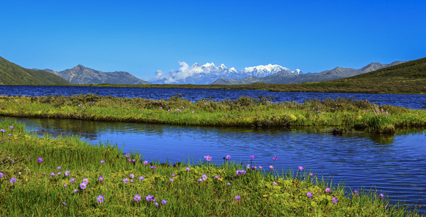 在山谷中穿行十余公里,路面一點(diǎn)點(diǎn)抬起,上了貢嘎山脈,徑直進(jìn)入康定情歌景區(qū)。隨著海拔的升高,涼意漸濃。山依舊是主角,地勢(shì)卻變得平緩而開闊,有茵茵的草地,有大小湖泊,沿途山泉潺潺,野花點(diǎn)綴,空氣清幽,方才單調(diào)的褐色很快被淡忘。山體漸次出現(xiàn)密集而低矮的灌木,枝條筆直地立著,有高寒山區(qū)的凜然之氣。灌木一層層上延,樹木雜多,大片的原始森林漫過山體,將大山包裹起來。遠(yuǎn)處,藍(lán)天白云之下,貢嘎雪山在群峰中探出頭來,擦亮高空的陽(yáng)光。澄明的空氣里,仿佛可以聽見雪??┛┑匦Αx那間,仿佛所有的大山,都開始舒展筋骨。
