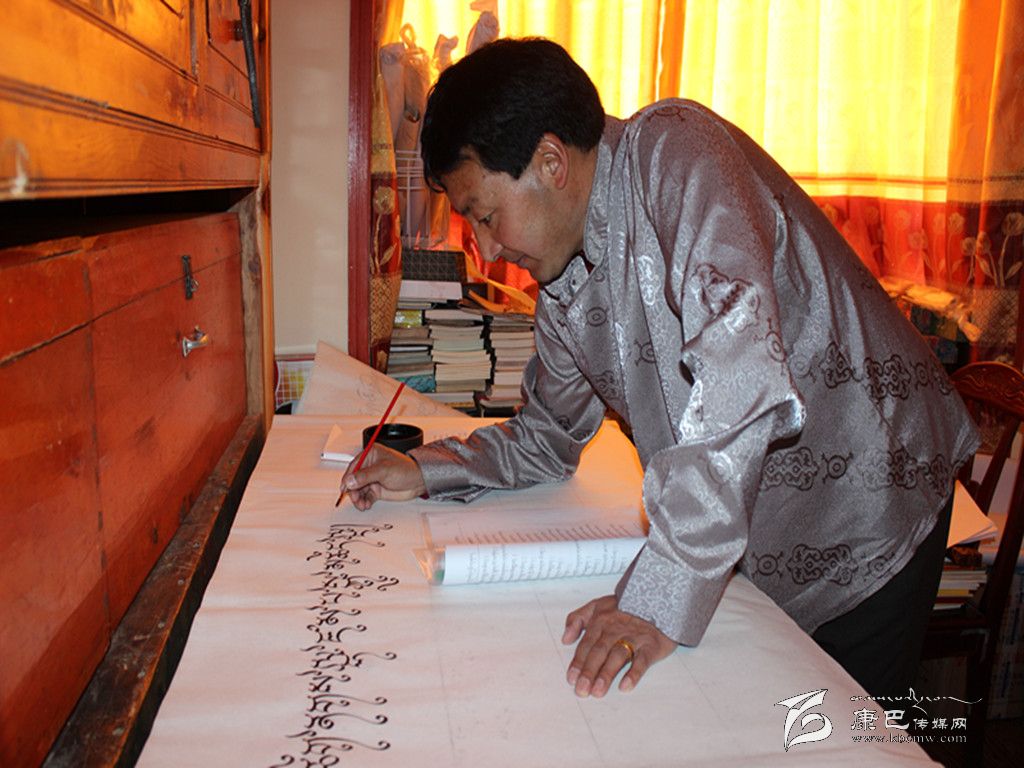 巴松鄧珠正在創(chuàng)作藏文書(shū)法。