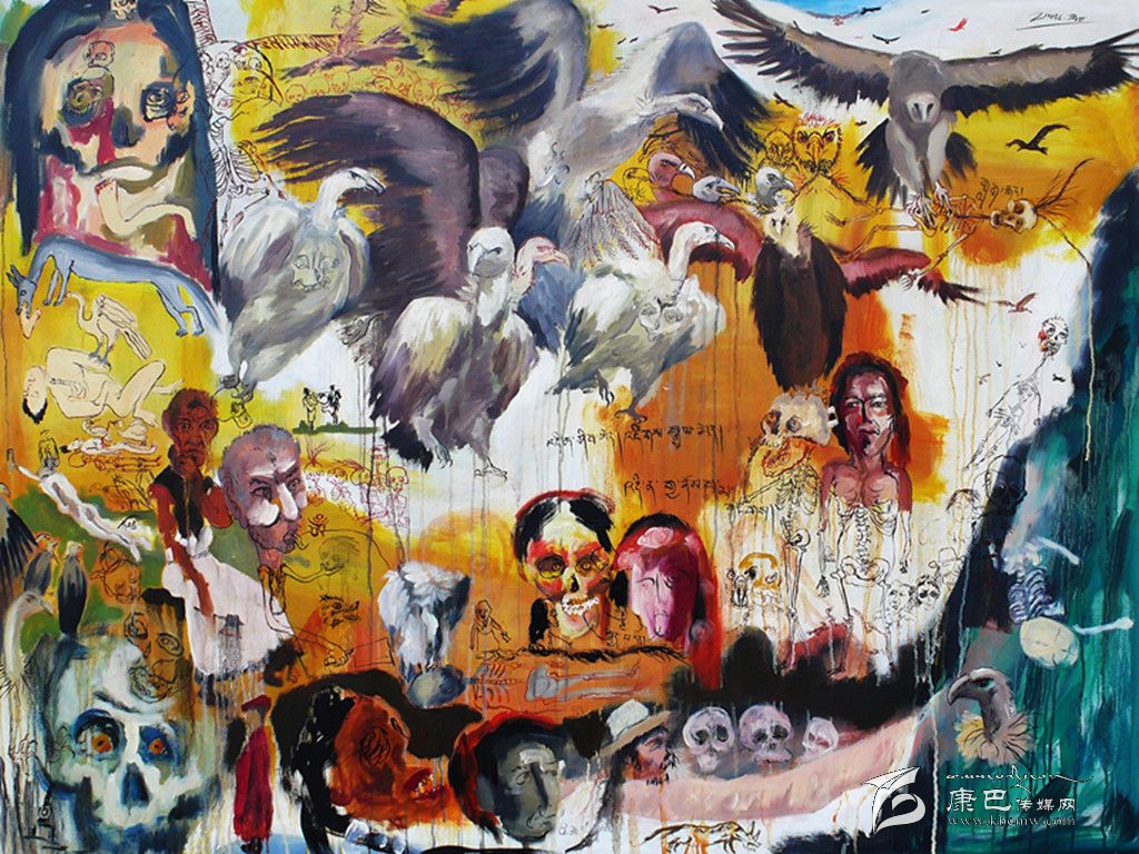 心態(tài)的豁達使周韜明確創(chuàng)作風(fēng)格后,很自然地創(chuàng)作了以藏區(qū)文化為主題的油畫系列,比如《沐浴節(jié)》、《活佛》、《天葬》、《女孩和她的夢》。比如,在《天葬》里周韜大量使用各種狀態(tài)的骷髏,對此他的理解是“從有些人來看,它可能代表了某種邪惡,但是從民族文化和精神層面來理解,它是藏區(qū)文化的一部分,也是藏族人對生命的一種觀看方式,比如藏戲和法會中就有專門的骷髏舞。”