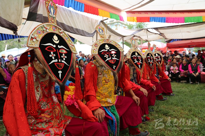 “亞堆”的第二天,藏戲正式開(kāi)演。首先出場(chǎng)的是《江嘎冉》和《扎西協(xié)哇》,這是藏戲中居首位的兩個(gè)最古老的戲,流淌著祝福吉祥、祈禱幸福的主弦律。在大號(hào)、鎖吶、胡琴、笛子、鼓、鈸的敲擊聲中,演員們戴著面具邊跳邊唱:
