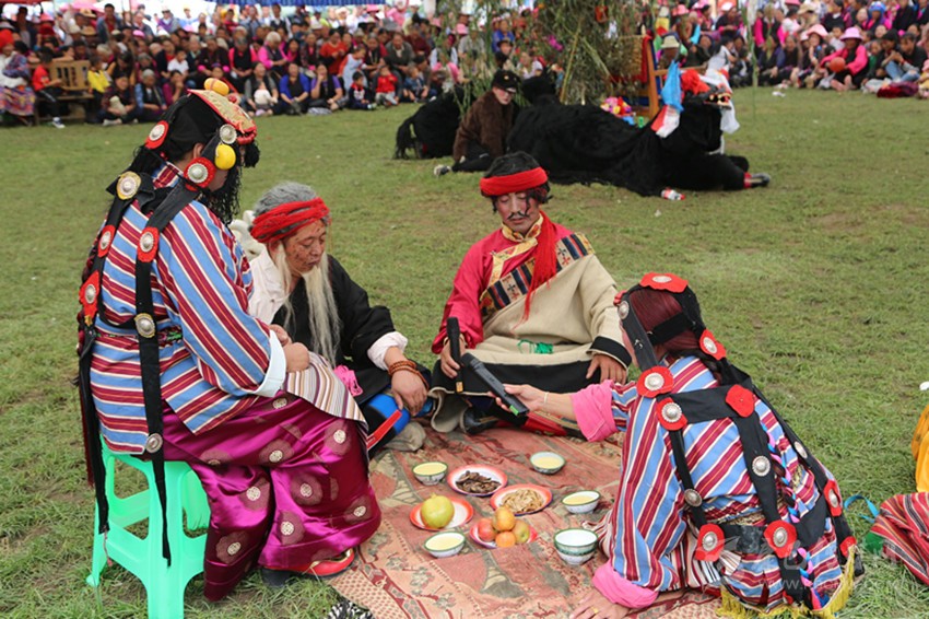 九月,龍王塘,藏戲《嘎拉旺布》演出現(xiàn)場(chǎng)。西繞反串花仙卓瓦桑姆,他頭戴花冠,頂上的三叉“巴珠”(后藏女人的一種頭飾)上插滿了粉色和紅色的絹花。身上穿著各色綢緞拼制成的無(wú)袖藏袍“拉姆切”,上套無(wú)袖彩條花氆氌帶和藍(lán)綠花緞帶連綴成的褂子。踩著鼓與鈸敲擊出的節(jié)奏,他的兩只腳進(jìn)、頓、點(diǎn)、退,舞步輕盈,手腕跟隨節(jié)奏,以頭部和肩部為限,左舞右蹈,用肢體語(yǔ)言表現(xiàn)人物的思想感情,這是該劇第一幕《定情月下》:湖畔仙景,卓瓦桑姆偕眾仙女婆娑起舞。國(guó)王隨仙鹿而來(lái),向卓瓦桑姆傾訴衷情,花仙為國(guó)王的真情所動(dòng),愿永結(jié)同心。仙翁降臨贈(zèng)箭祝福,二人辭別眾仙……。炎炎烈日下,西繞薄施脂粉的面頰已被幾行汗水弄花,但他不以為意,此時(shí)此刻,他不是西繞,而是花仙卓瓦桑姆。從進(jìn)場(chǎng)伊始,他便與角色融為一體。周遭的觀眾認(rèn)真觀看、解讀,現(xiàn)場(chǎng)一片和諧,最美的時(shí)光在這一刻被盡情雕刻。