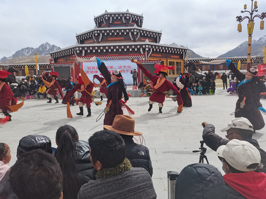 這邊搭起咨詢臺為群眾送衛(wèi)生、送科技、送法治,那邊搭起舞臺為群眾奉上了一場精彩的文藝表演。本土山歌《甘孜山歌》、獨唱原創(chuàng)歌曲、舞蹈《甘孜踢踏》《嶺·卓》等群眾喜聞樂見的節(jié)目輪番登場,贏得陣陣掌聲。