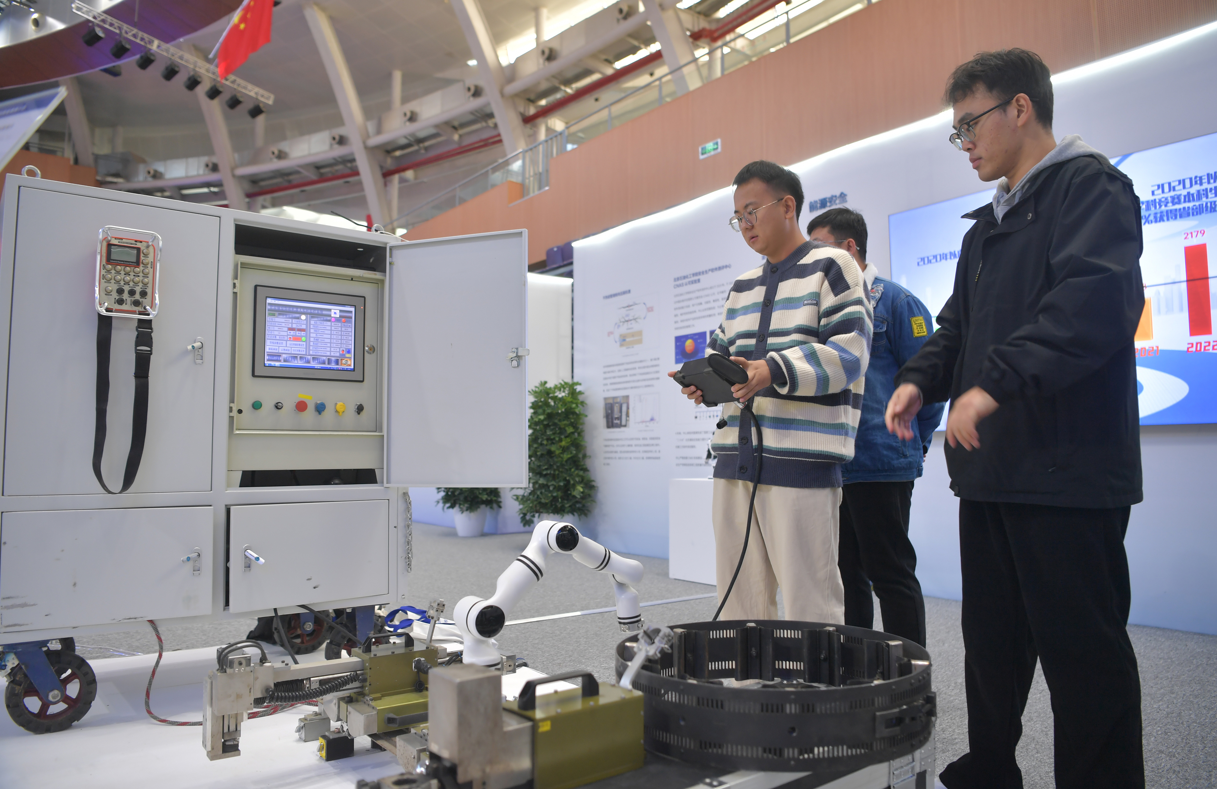 2023年,京南地區(qū)高校科技成果推介會(huì)在北京建筑大學(xué)大興校區(qū)舉行。圖為高校師生在展示管道全位置焊接機(jī)器人系統(tǒng)成果。