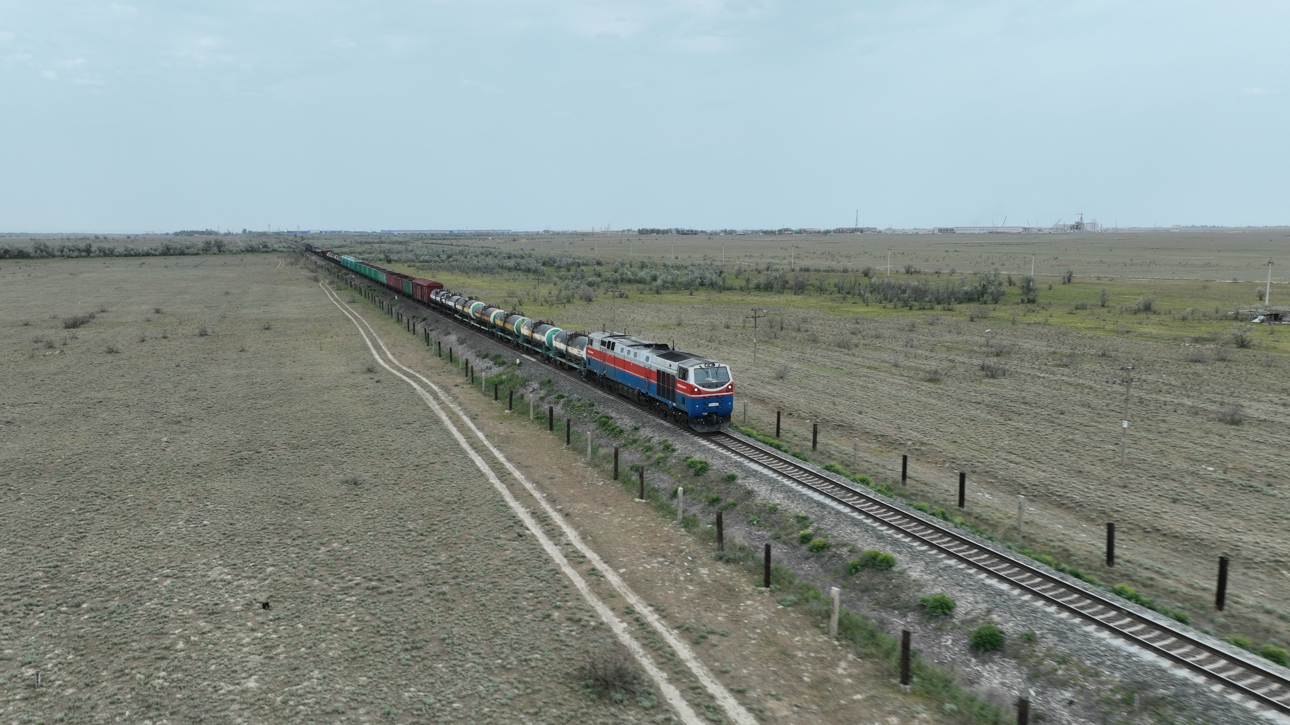 △ 2023年5月12日,在哈薩克斯坦阿拉木圖附近,貨運列車馳騁于阿拉木圖與中國霍爾果斯間(無人機(jī)照片)。