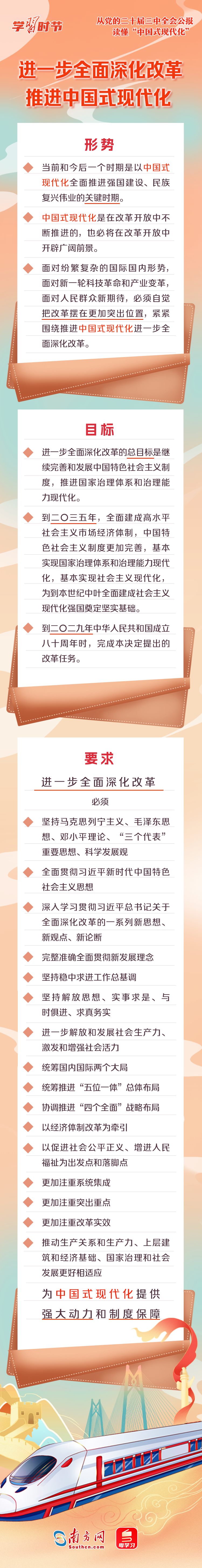 中國(guó)式現(xiàn)代化是中國(guó)共產(chǎn)黨和中國(guó)人民長(zhǎng)期實(shí)踐探索的成果,是一項(xiàng)偉大而艱巨的事業(yè)。全會(huì)公報(bào)中,“中國(guó)式現(xiàn)代化”一詞被反復(fù)提及,深刻闡述了進(jìn)一步全面深化改革與推進(jìn)中國(guó)式現(xiàn)代化的關(guān)系,以及中國(guó)式現(xiàn)代化的重要保障、必然要求、本質(zhì)要求等重要內(nèi)容。一起來(lái)學(xué)習(xí)!