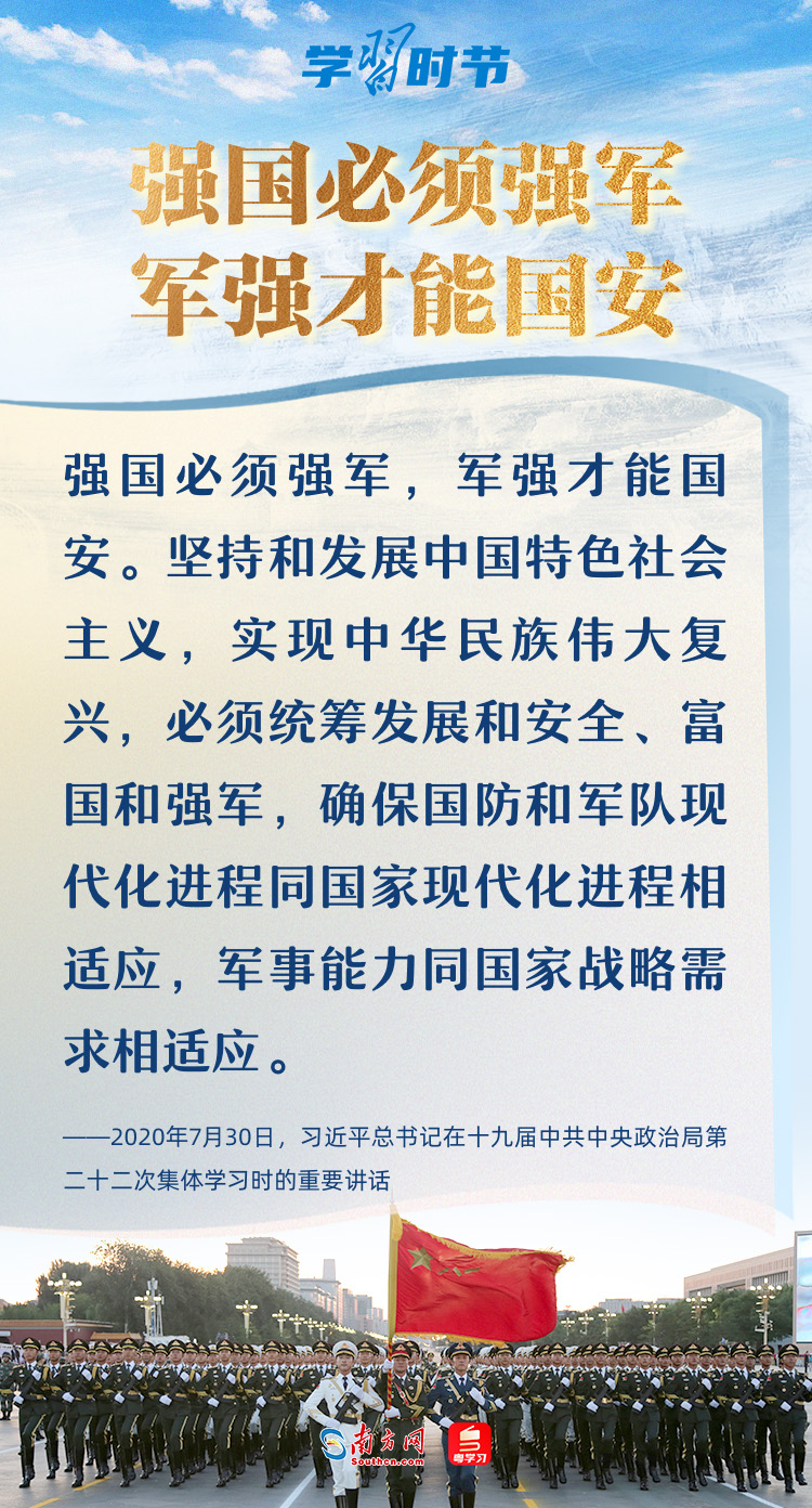 強(qiáng)國必須強(qiáng)軍,軍強(qiáng)才能國安。黨的十八大以來,以習(xí)近平同志為核心的黨中央領(lǐng)導(dǎo)軍隊(duì)和國防建設(shè),開啟強(qiáng)軍興軍新征程,形成了習(xí)近平強(qiáng)軍思想,指引人民軍隊(duì)朝著實(shí)現(xiàn)新時(shí)代強(qiáng)軍目標(biāo)、全面建成世界一流軍隊(duì)奮勇前行。在八一建軍節(jié)到來之際,讓我們一起回顧總書記那些振奮人心的強(qiáng)軍話語。