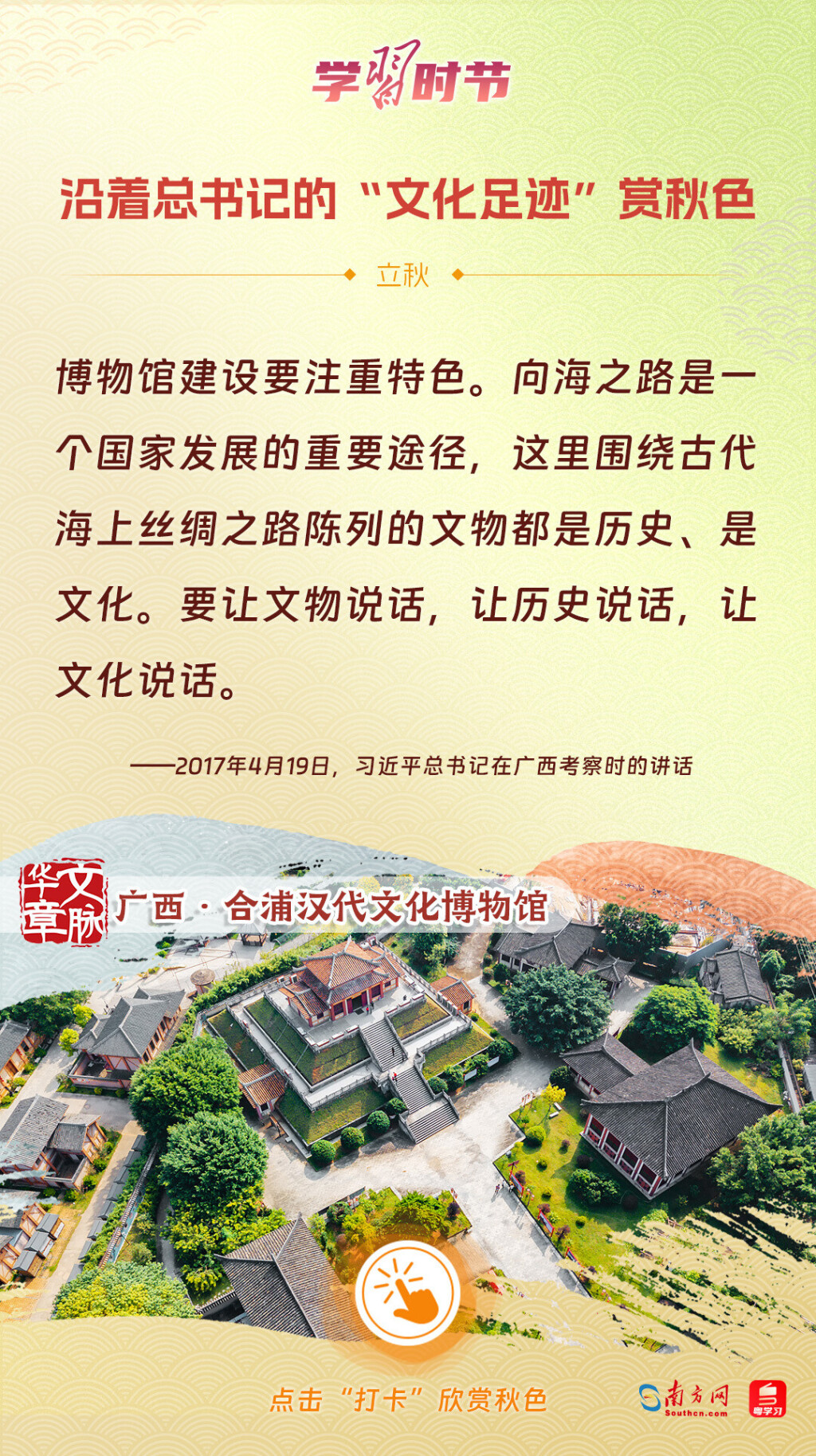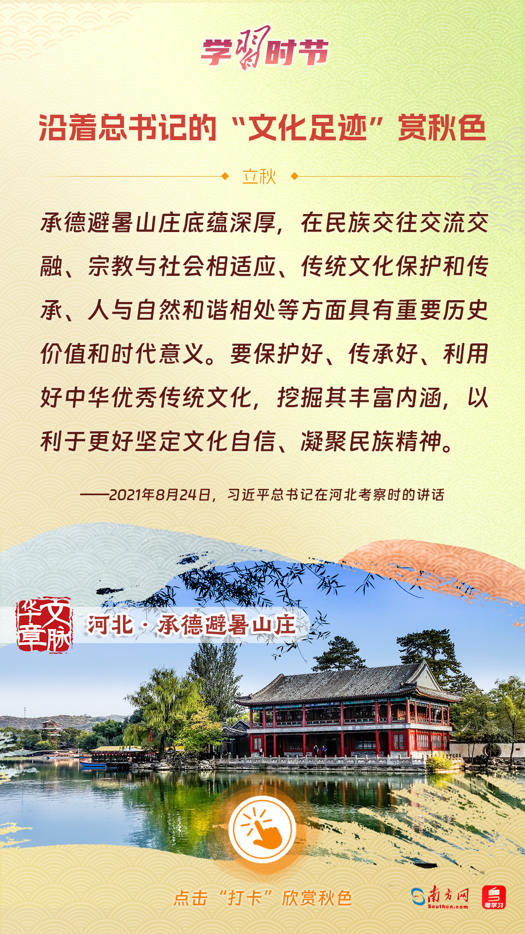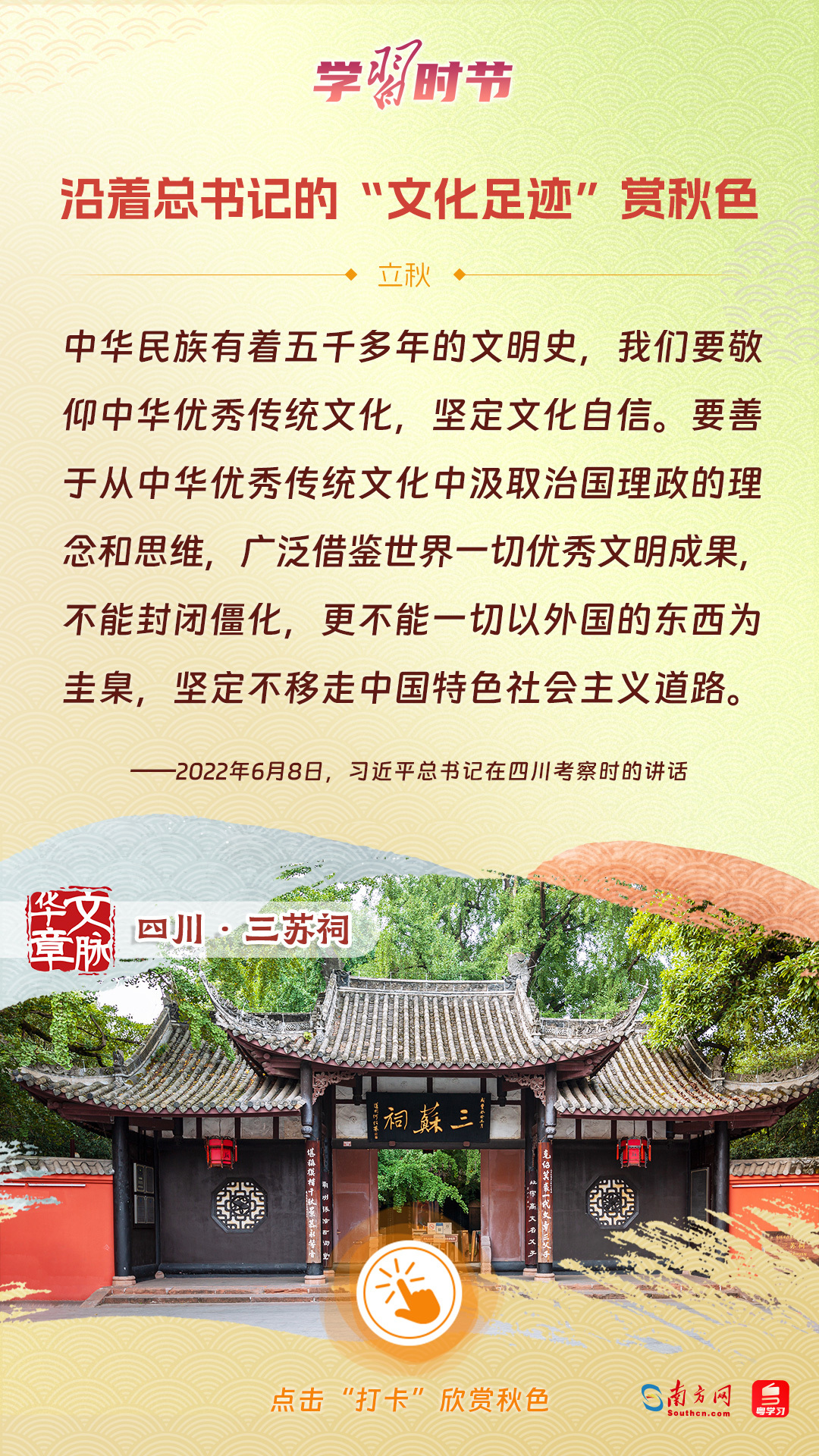 立秋之際,讓我們一起跟隨習(xí)近平總書記的足跡,學(xué)習(xí)習(xí)近平總書記關(guān)于文化建設(shè)的重要論述,感受全國各地文化地標(biāo)古跡的秋意,汲取文化自信的強(qiáng)大力量。