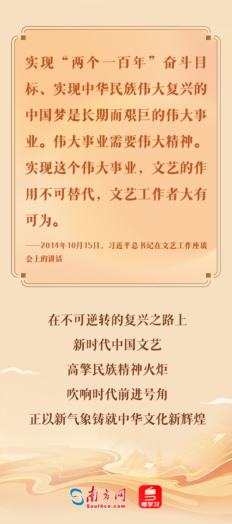 文藝事業(yè)是黨和人民的重要事業(yè),文藝戰(zhàn)線是黨和人民的重要戰(zhàn)線。2014年10月15日,習(xí)近平總書(shū)記主持召開(kāi)文藝工作座談會(huì)并發(fā)表重要講話,為推動(dòng)新時(shí)代文藝繁榮發(fā)展指明了前進(jìn)方向。